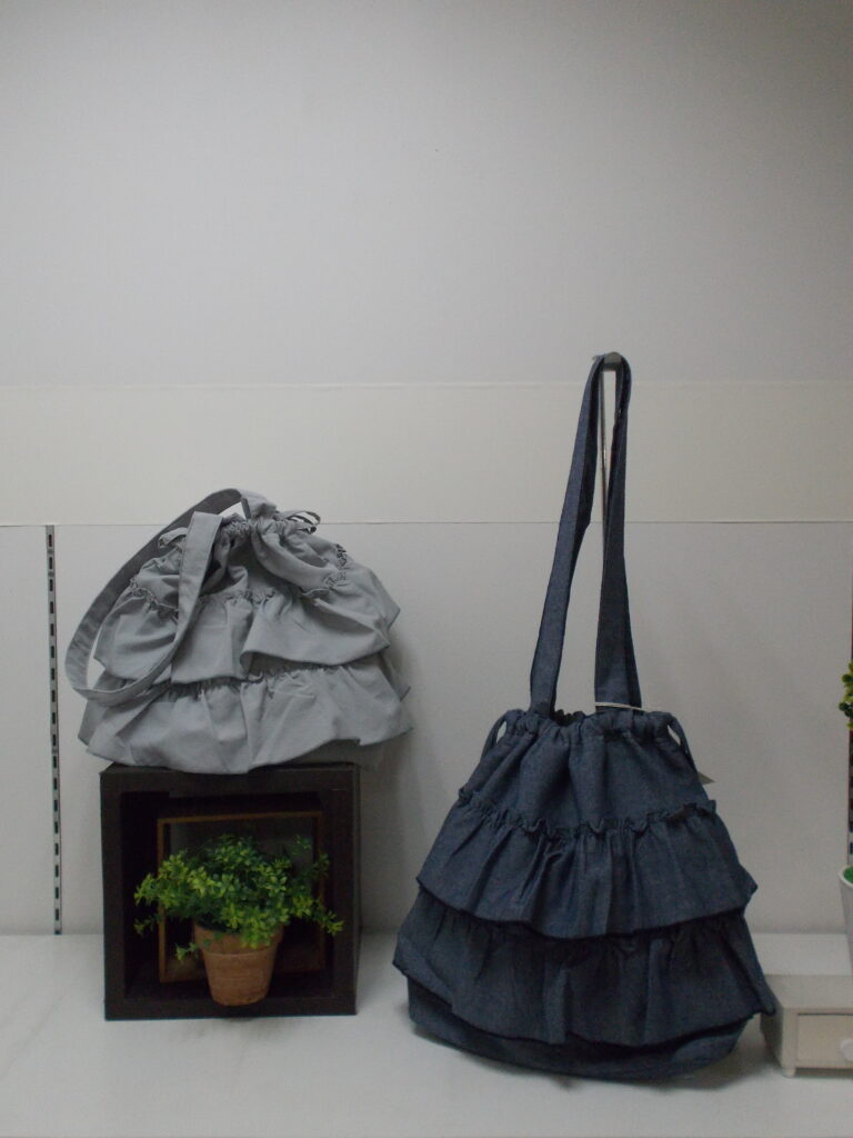 巾着仕様で、口を絞るとコロンとした可愛らしいシルエット、A4サイズも入る大きさで使い勝手もよく、2段のフリルがコーディネートのポイントです。