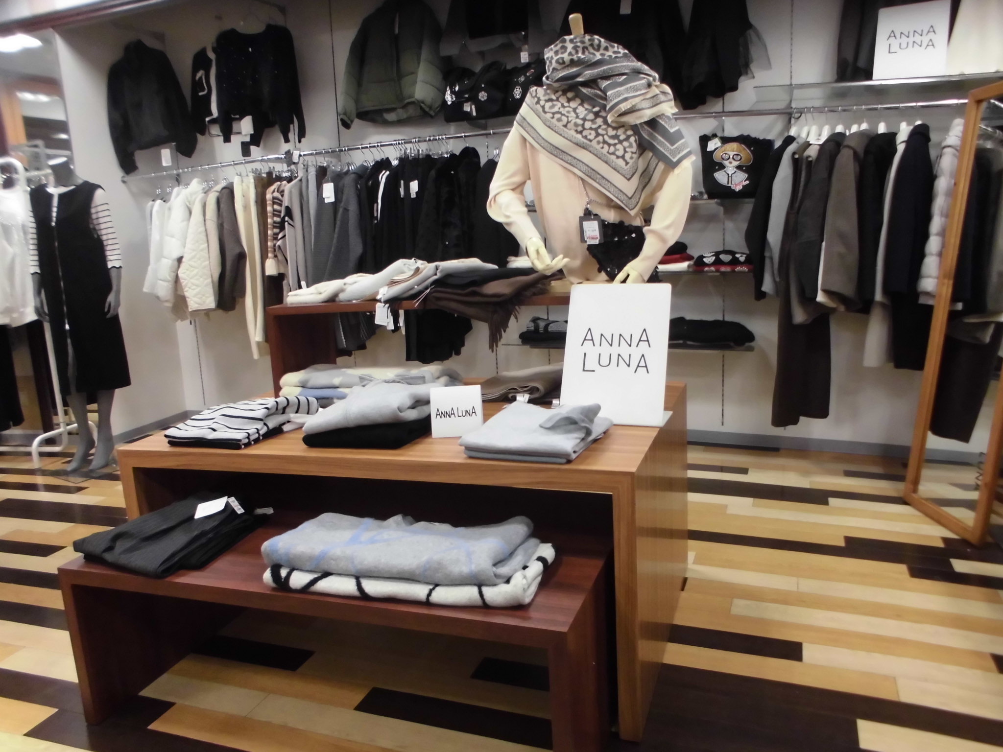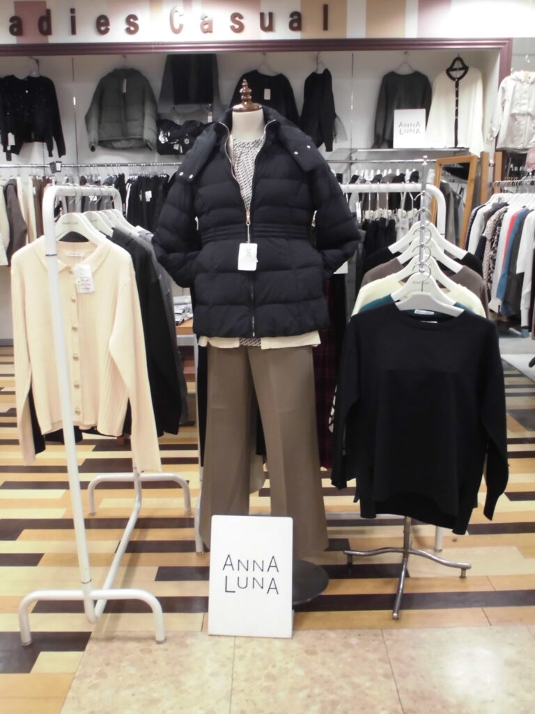 中綿アウター¥15,389(税込)、リブカーデ¥2,745(税込)、ストレッチパンツ¥5,489(税込)。