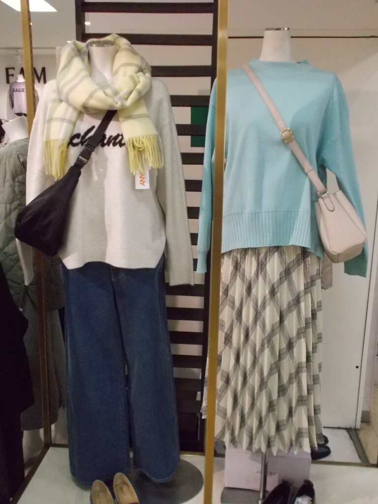 バイカラーMIXやスパンコールニットなどカジュアル着にも程よく上品見えスタイルに
