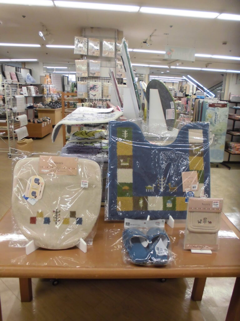 トイレマット¥3、850(税込)、フタカバー¥3,300(税込)、スリッパ¥1,980(税込)、ペーパーホルダーカバー¥1,650(税込)