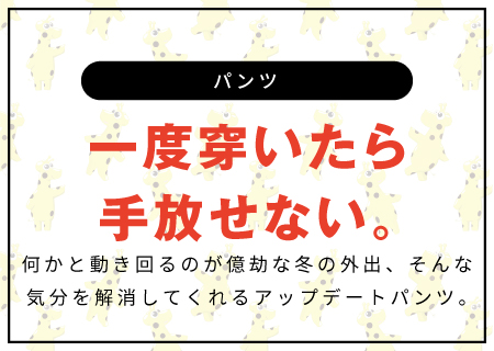 何かと動き回るのが億劫な冬の外出、そんな気分を解消してくれるアップデートパンツ。